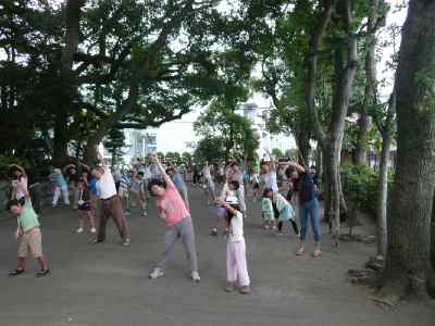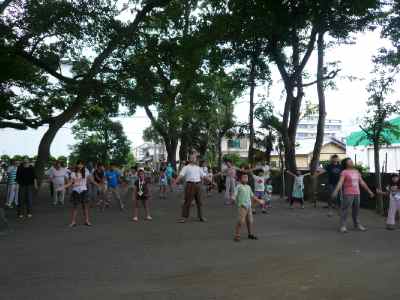 七区は5時から夜店とイベント,7時から踊りが行なわれました、テントの下では焼きそば、フランクフルト、たこ焼き、ポップコーン、生ビール、テントの外ではかき氷や輪投げなどのゲームがおこなわれ,大人も子供も大勢つめかけました
